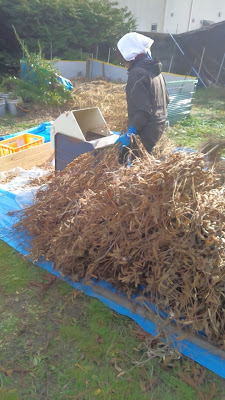 12月23日、大豆の脱穀4回目、今日はいつものメンバーでの作業、あおばた豆の脱穀は、量が少ないのでKさん一人で脱穀しました。