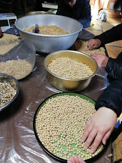28日の蒟蒻作りの後の味噌用大豆の選別作業写真です。今日は約40キロの大豆選別をしました。